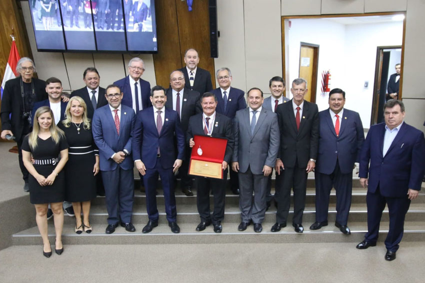El presidente de la Cámara de Diputados, Raúl Latorre (ANR-Capital), tuvo a su cargo la imposición del pin y el collar de la “Orden Nacional al Mérito Comuneros”, además de la entrega de una placa conmemorativa que sintetiza el reconocimiento a más de cinco décadas de servicio cultural.