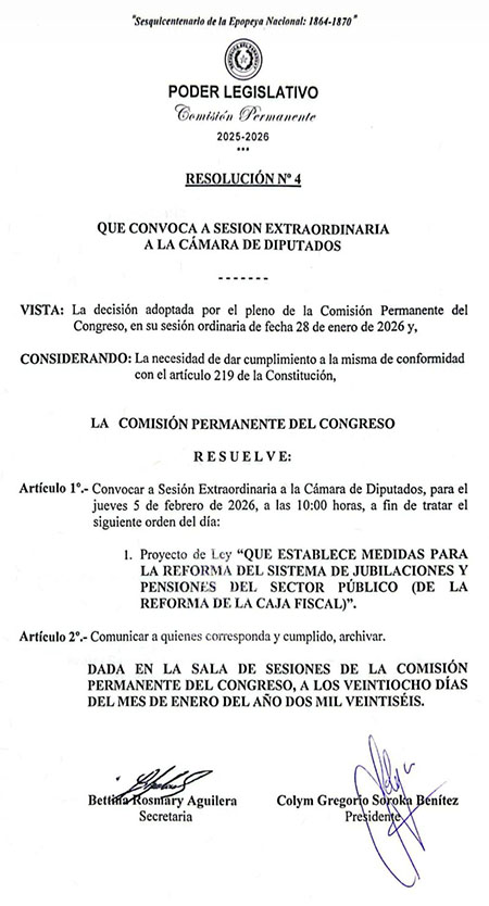 (Redacción: Prensa - Dirección de Comunicación). En reunión mantenida en la jornada de este miércoles, la Comisión Permanente del Congreso, cuya presidencia corresponde al senador Colym Soroka (ANR), aprobó un pedido de sesión extraordinaria de la Cámara de Diputados para dar tratamiento al proyecto de ley “Que establece medidas para la reforma del Sistema de Jubilaciones y Pensiones del Sector Público (Reforma de la Caja Fiscal)”.