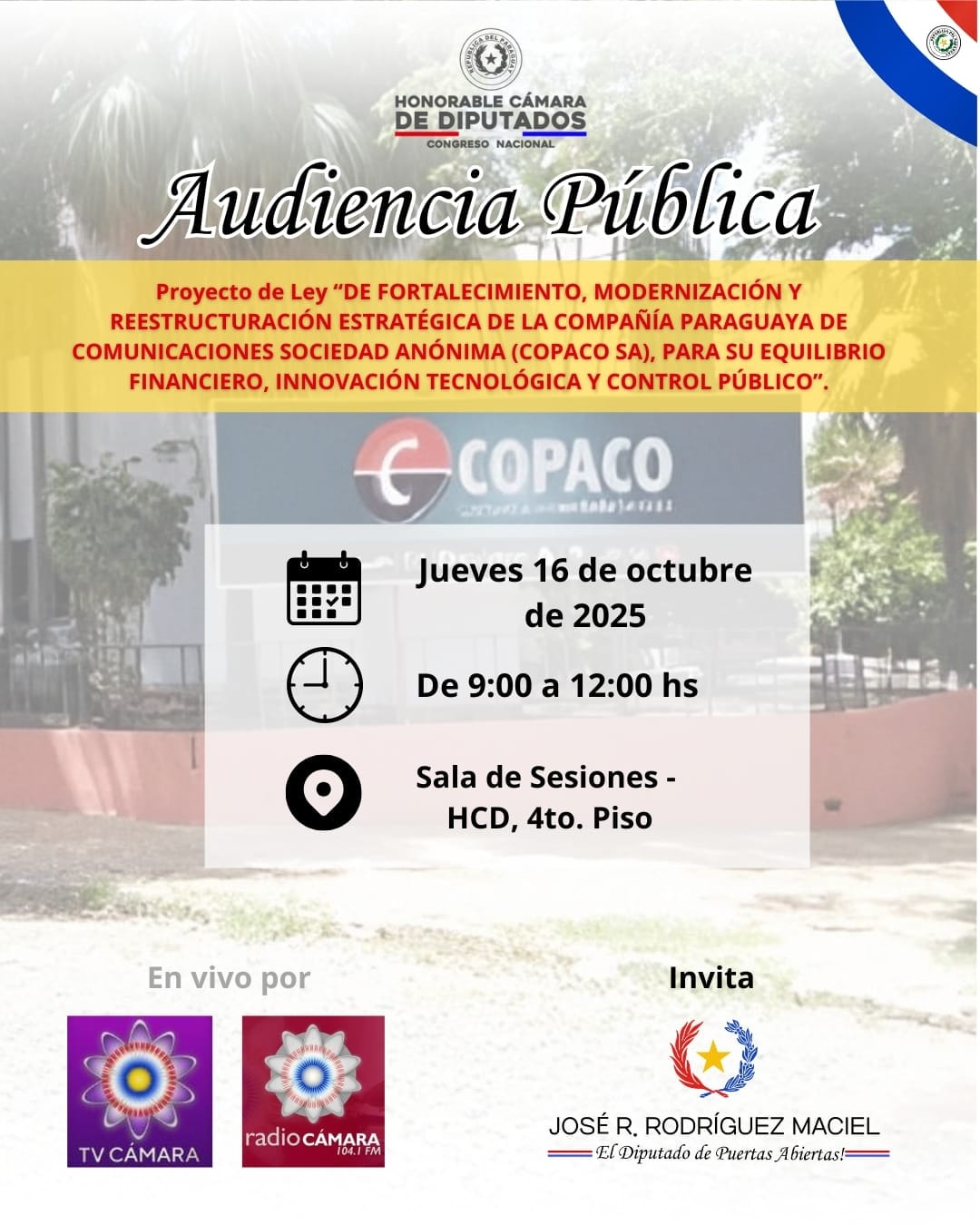 (Redacción: Prensa – Dirección de Comunicación). A instancias del diputado José Rodríguez (ANR-Capital), el próximo 16 de octubre se llevará a cabo una audiencia pública para tratar el proyecto de ley “De fortalecimiento, modernización y reestructuración estratégica de la Compañía Paraguaya de Comunicaciones Sociedad Anónima (COPACO S.A.), para su equilibrio financiero, innovación tecnológica y control público”.